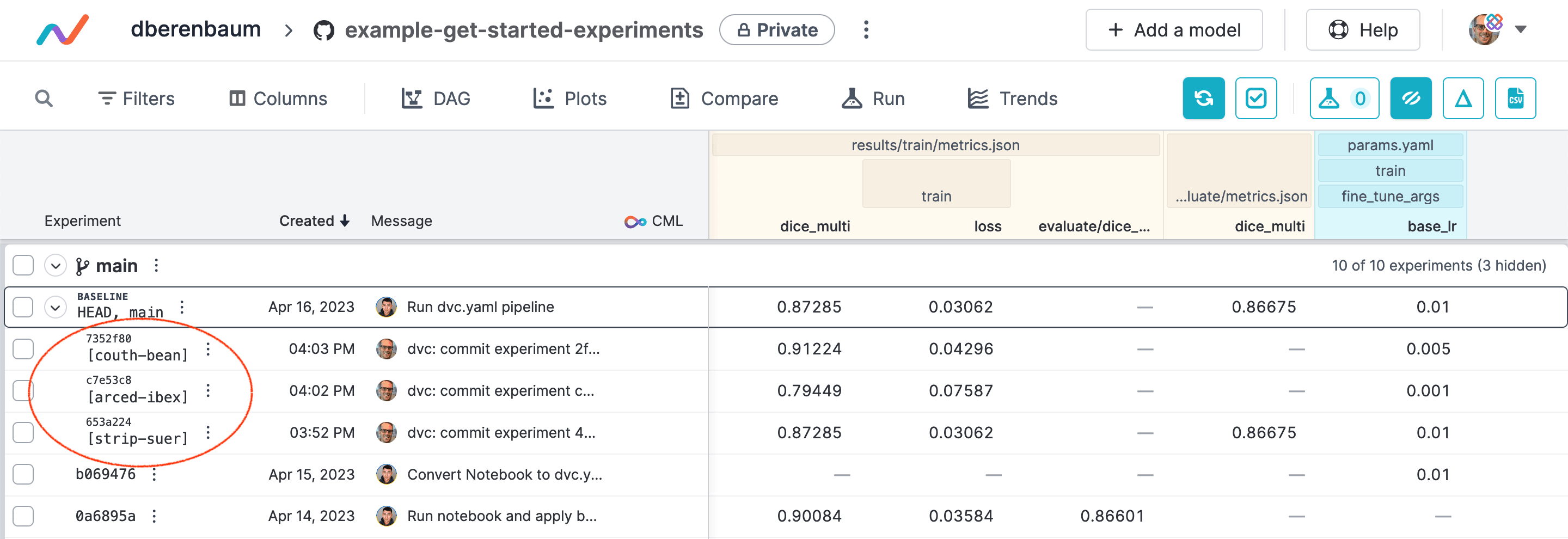 From your workspace, you can see pushed experiments if you provide a Git remote